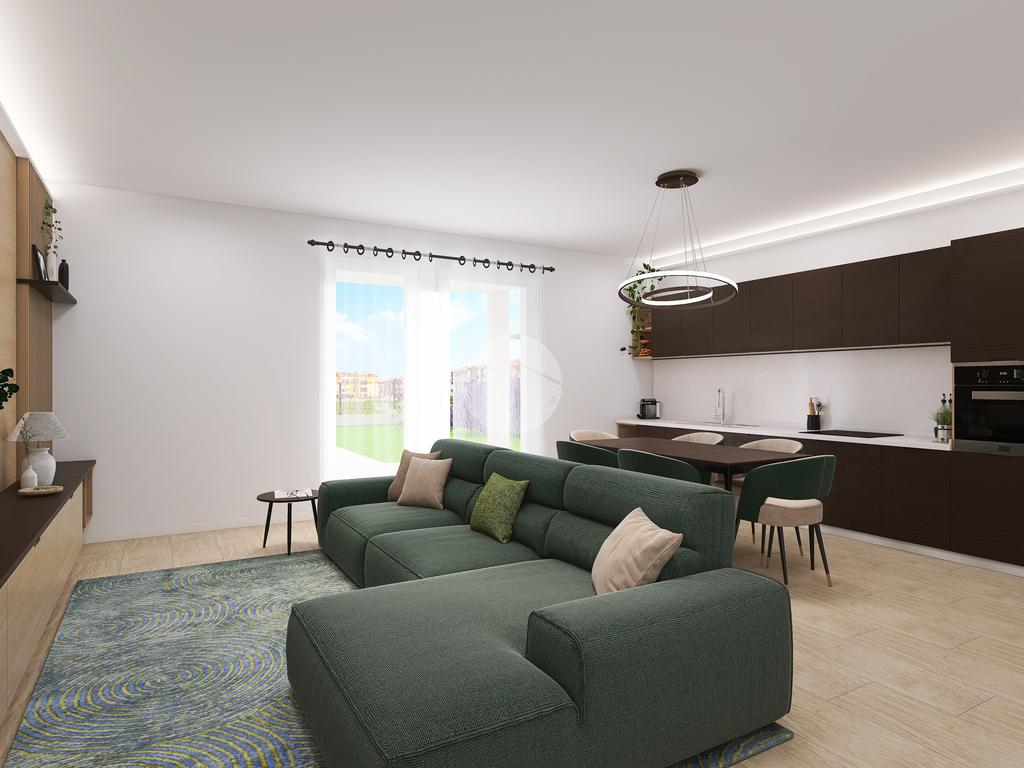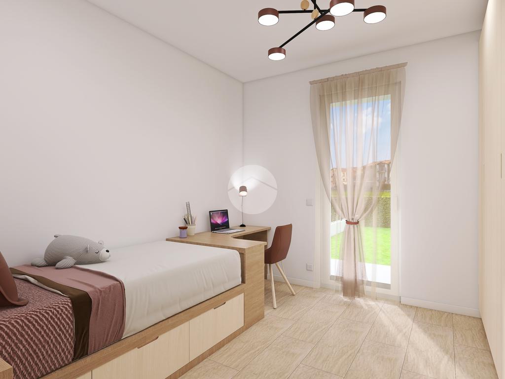 L’appartamento sorge al piano terra e si compone di una zona giorno con angolo cottura, una camera matrimoniale con bagno padronale, due camere doppie, un bagno finestrato con doccia e un box auto doppio in larghezza. Arricchito da un ingresso indipendente e da un giardino fronte/retro con porticato.