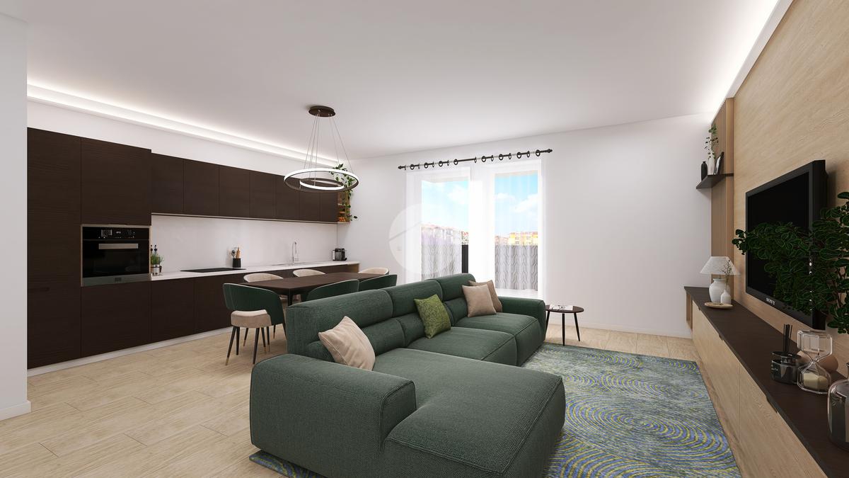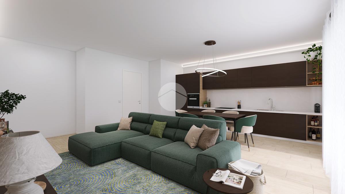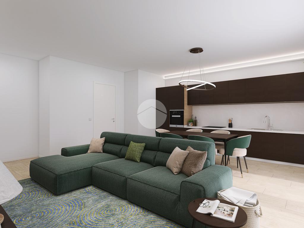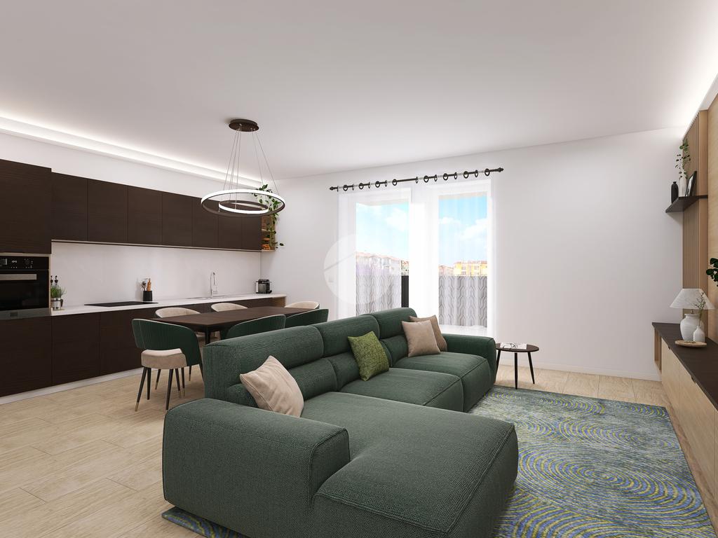 L’appartamento sorge al primo piano e si compone di una zona giorno con angolo cottura e accesso diretto ad una terrazza abitabile, una camera matrimoniale, due camere doppie con balcone, due bagni con doccia e un box auto doppio.